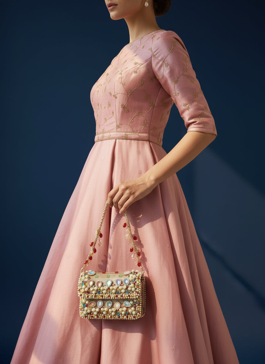 Step into every celebration with elegance and color — the Golden Radiance Handcrafted Beaded Clutch from House of Madhulika is designed to be your statement accessory. Adorned with shimmering pearls, intricate beadwork, and radiant multicolor gemstones, this clutch beautifully captures the spirit of Indian festivities.