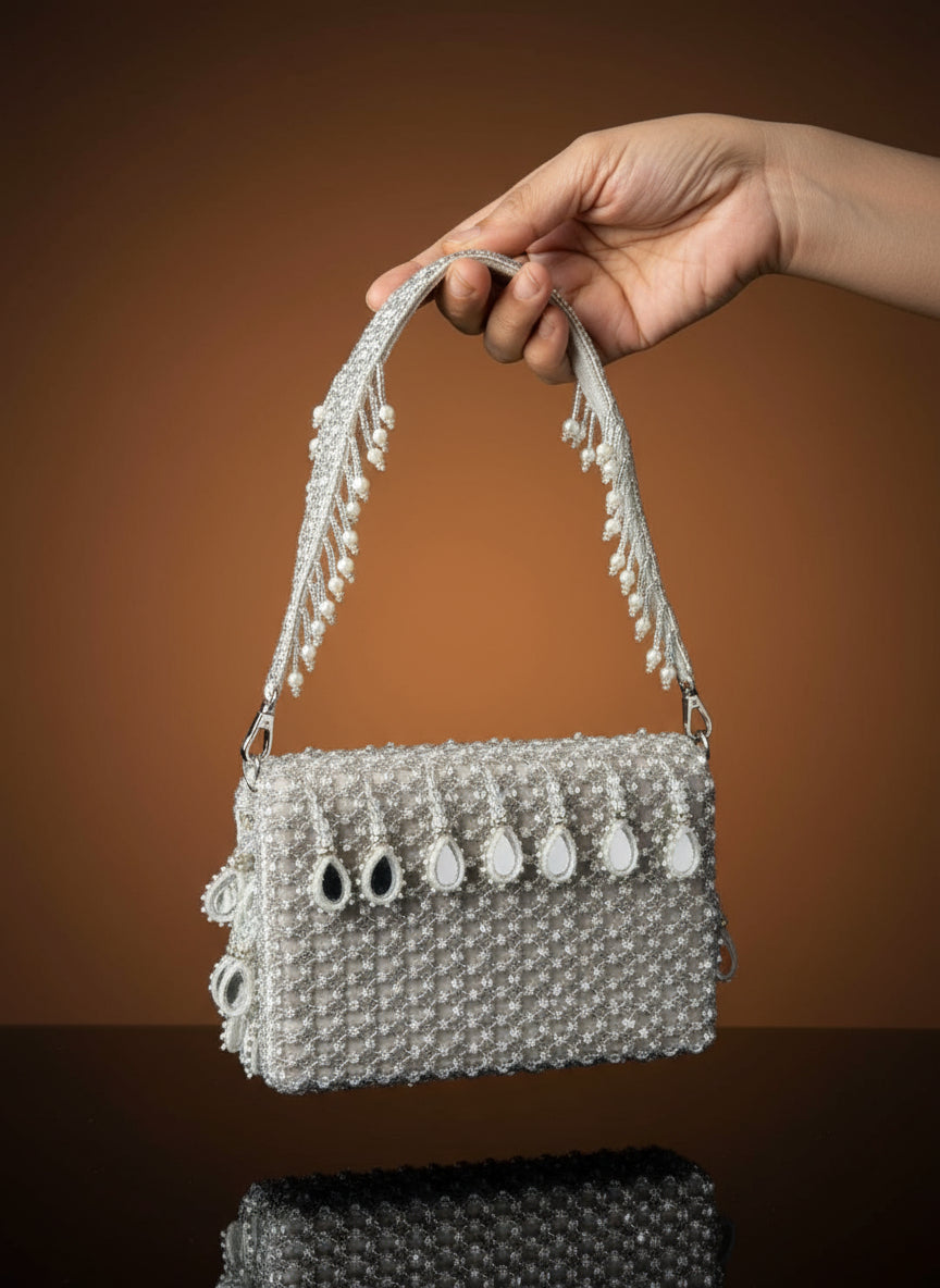 A statement piece that defines elegance — this handcrafted silver clutch features mirror drop detailing and intricate beadwork that sparkles with every move. Designed with a wide embellished handle for a royal touch, it’s the perfect accessory for weddings, festive gatherings, and evening parties.